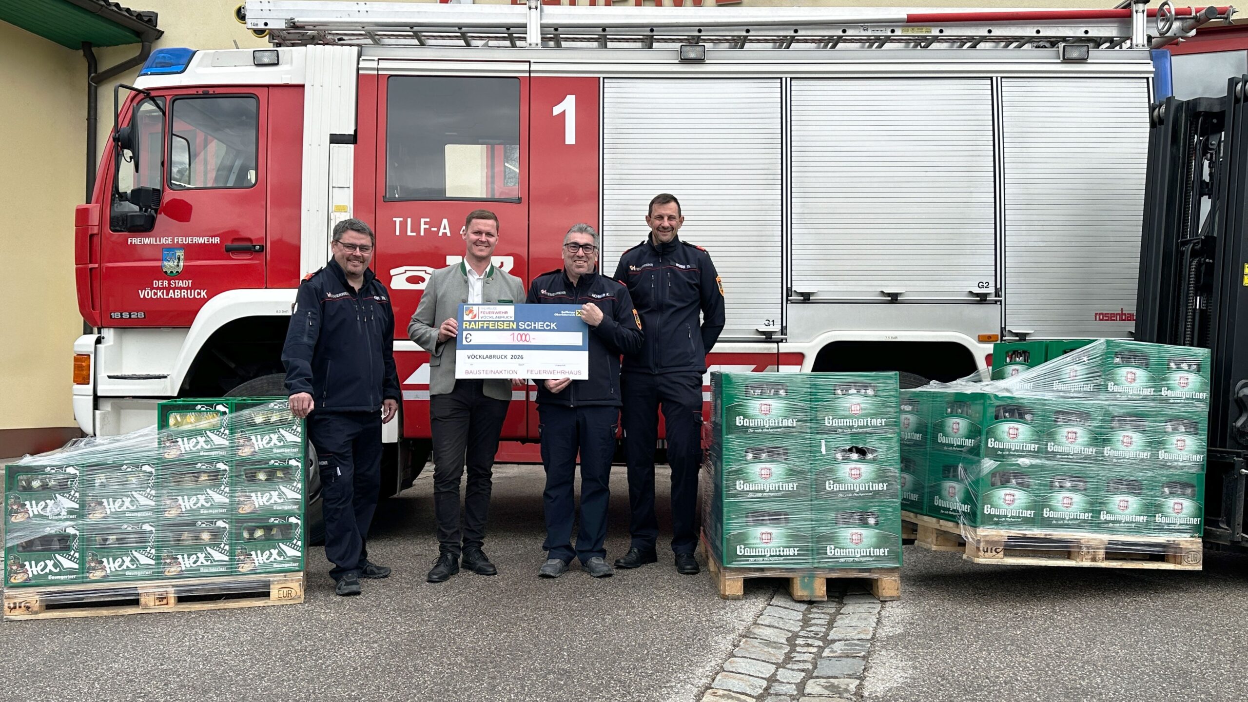 Eine besondere Sachspende erreichte die Freiwillige Feuerwehr Vöcklabruck von der Baumgartner Brauerei aus Schärding:Im Rahmen unserer Bausteinaktion stellte das Unternehmen Getränke im Wert von rund 1.000 € – darunter Bier