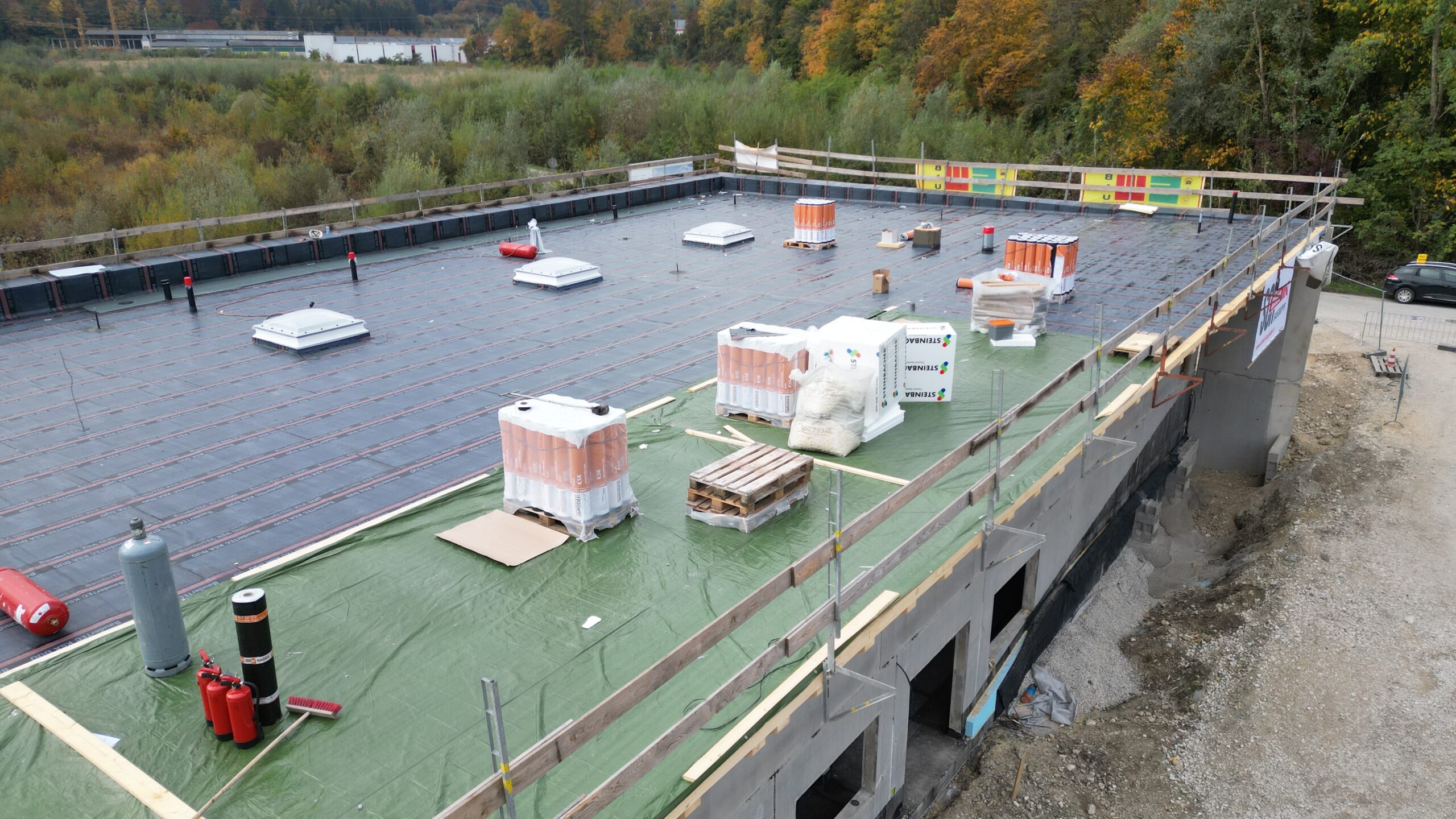 Am Kopfgebäude kam die Dachisolierung zum Einsatz, gleichzeitig wurden die Dacharbeiten weitergeführt. Damit rückt die Fertigstellung der Gebäudehülle immer näher.