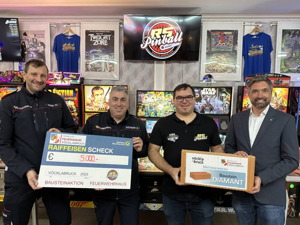 Mit einer großzügigen Spende von 5.000 € unterstützt er die Feuerwehr Vöcklabruck – dafür wurde ihm symbolisch der Diamant-Baustein überreicht, die höchste Stufe unserer Bausteinaktion.