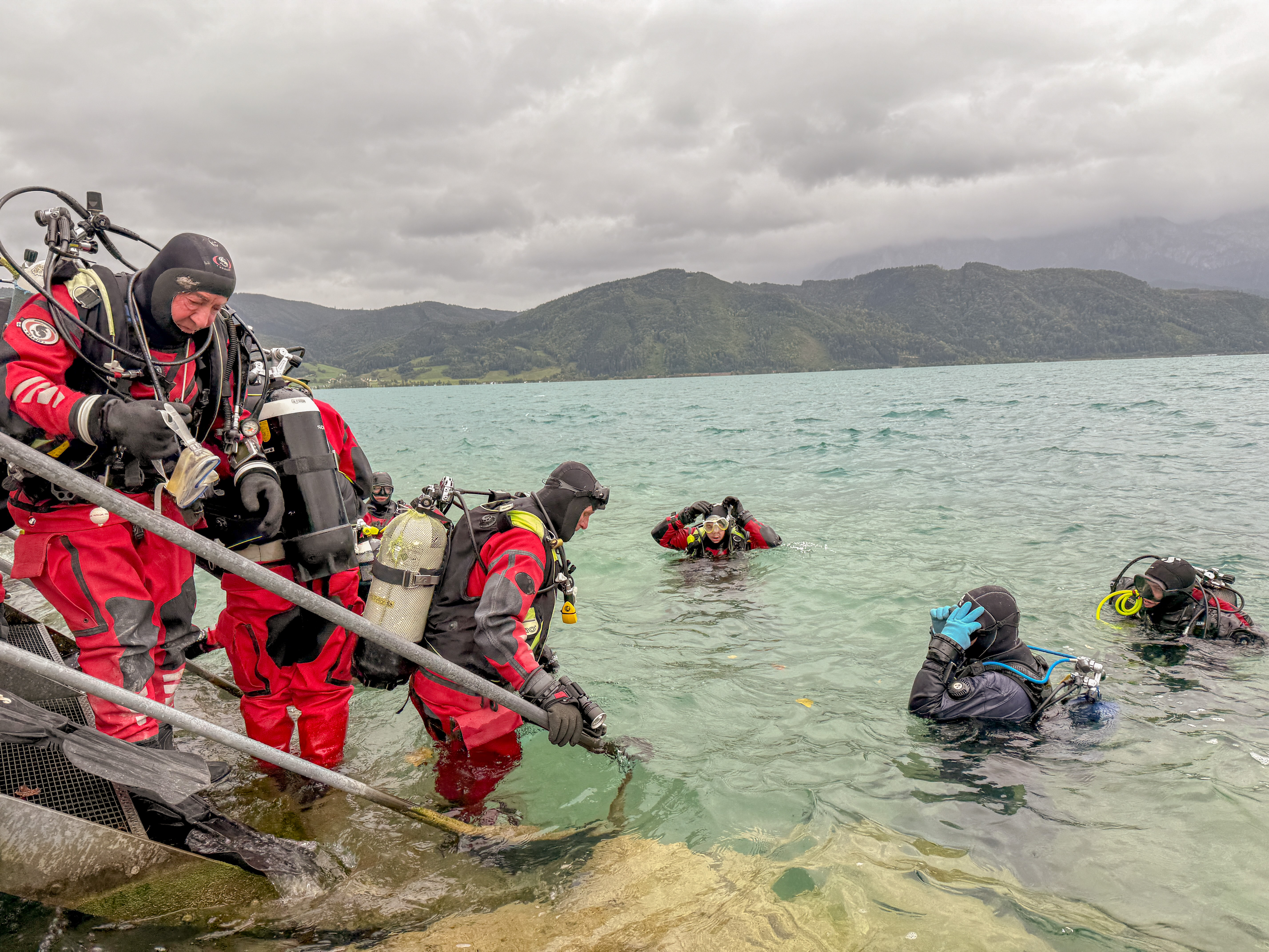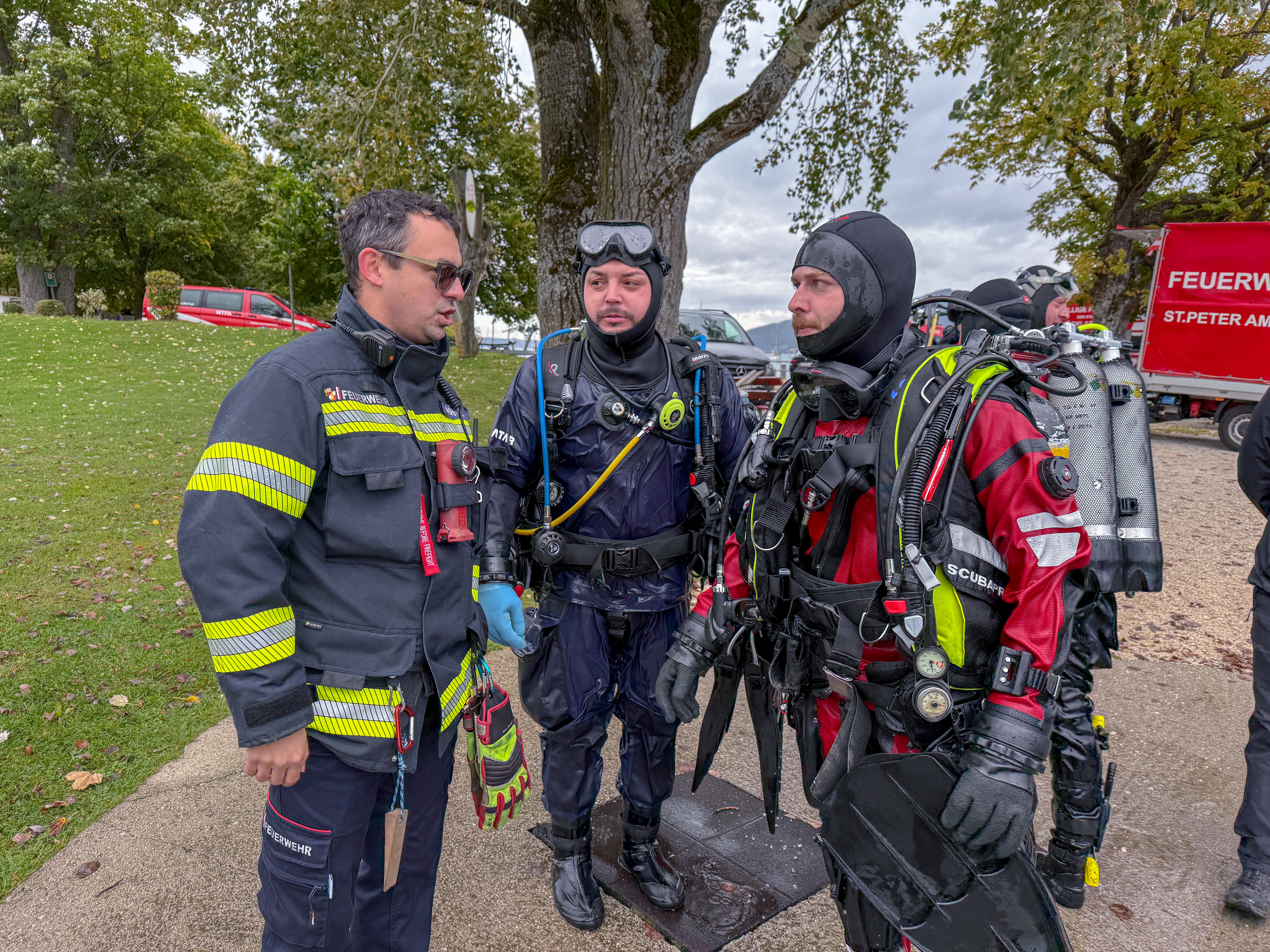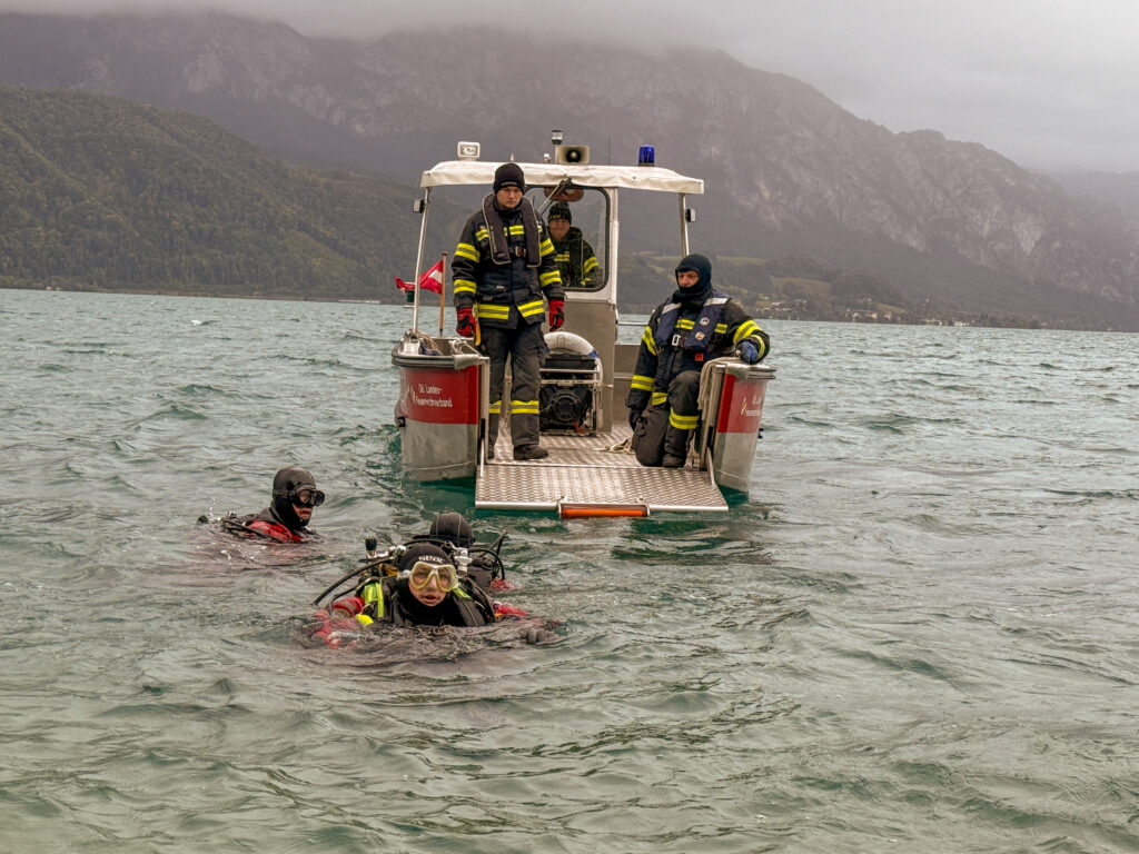 Am Tauchplatz Hausboot in Nussdorf fand im Oktober eine gemeinsame Tauchübung der Feuerwehren Seewalchen, Vöcklabruck, St. Peter am Hart (BR) und Mondsee statt. Übungsannahme war ein abgängiger Taucher im Bereich des Tauchplatzes Hausboot. Die Suchaktion erfolgte unter Wasser mittels Leinensuche, parallel dazu führte die Technikgruppe vom Ufer aus eine Suche mit dem neuen Tauchroboter durch. In rund 15 Metern Tiefe konnte die „vermisste Person“ gefunden werden. Die Feuerwehrboote aus Vöcklabruck und Seewalchen unterstützten die Teams auf dem Wasser.